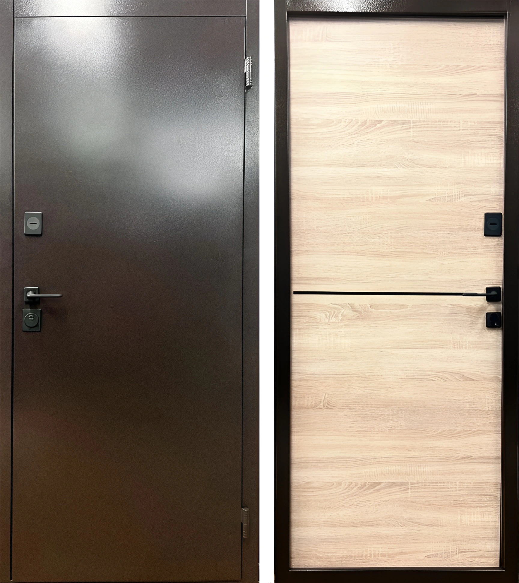 Входная дверь с полимерной краской и ламинатом RAL 8019 Дуб Сонома с молдингом