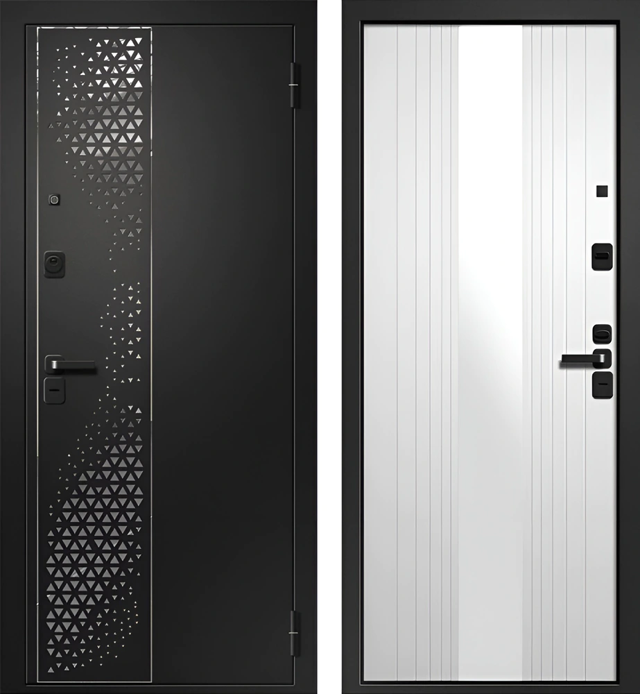 Входная дверь с терморазрывом с молдинг-инсталляцией «Торжество геометрии» с зеркалом внутри