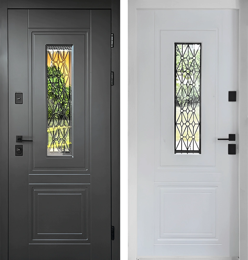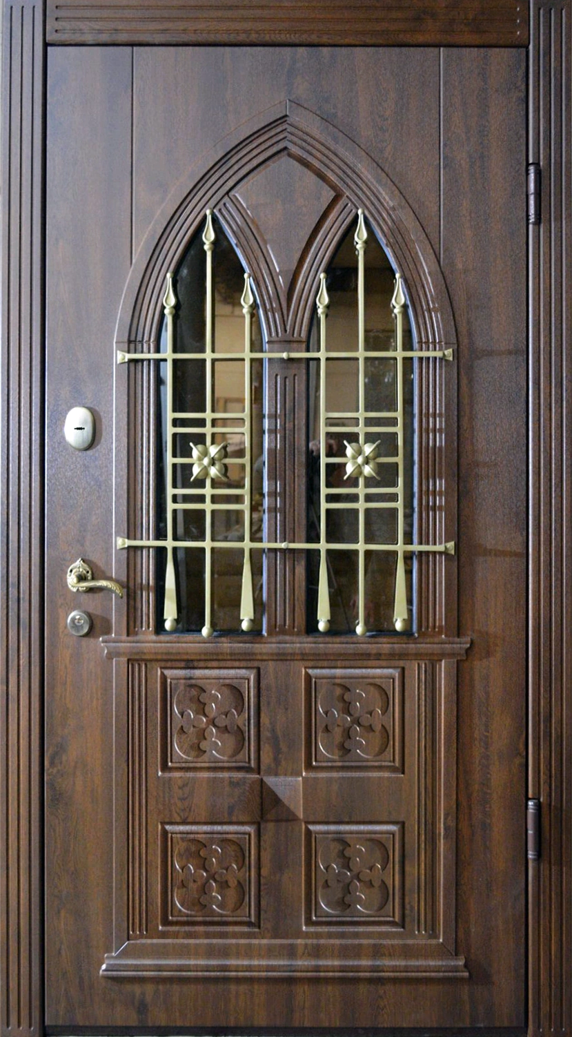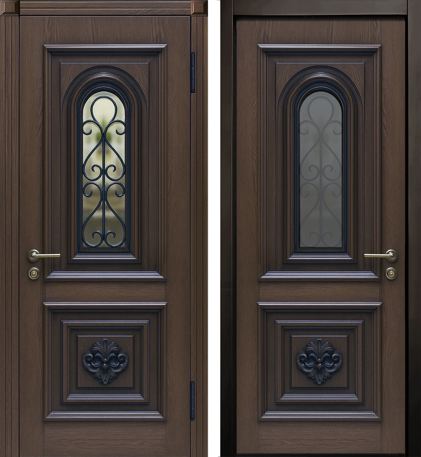 Входная дверь со стеклопакетом и кованым узором МДФ Тиковое Дерево Жасмин морозостойкая