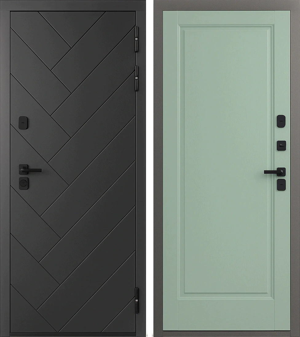 Входная дверь с фрезеровкой геометрия минимализм МДФ Лунная Ночь Серо-зелёный