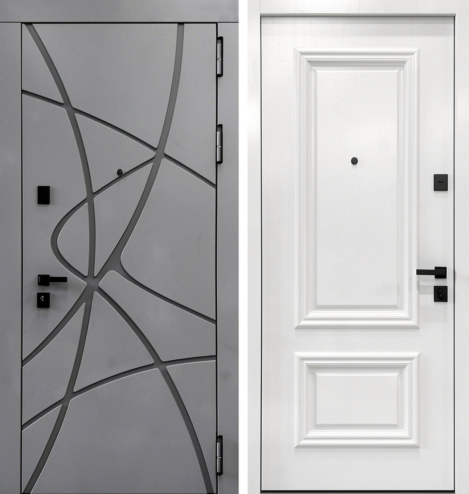Филенчатая входная дверь для установки в квартире. Утолщённые панели МДФ 18 мм и двойное наполнение обеспечивают шумоизоляцию не менее 47 дБ. Сочетание классического и модерн стилей. Цветовая палитра: Телегрей и Белоснежный.